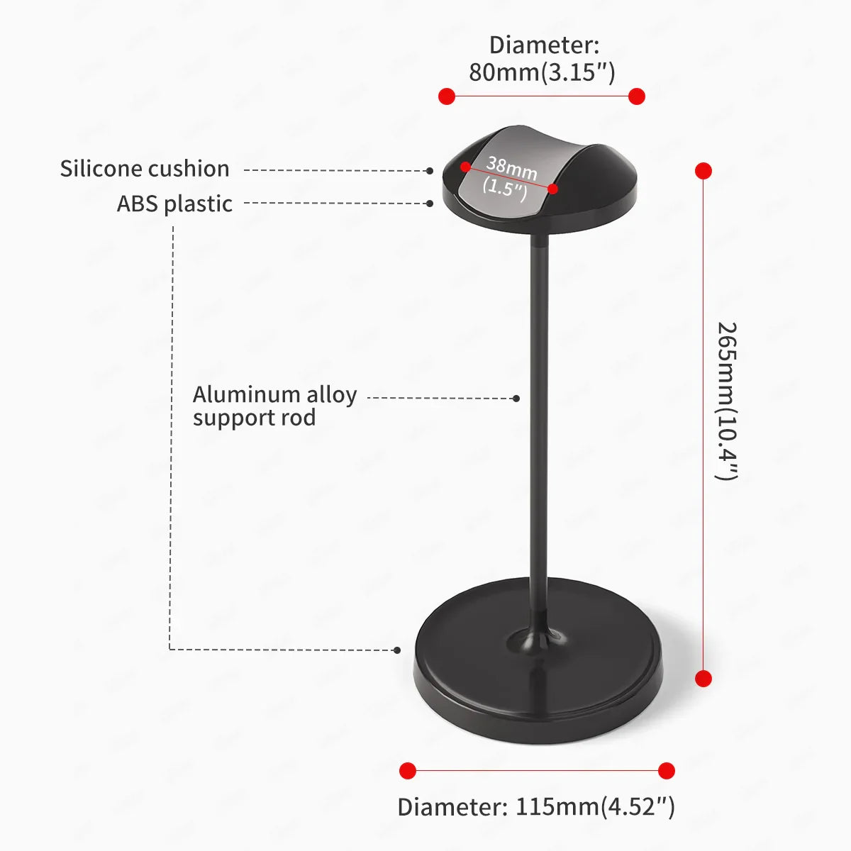 4cm width, 26cm height, curved top support, holds most of headphones, such as Bluetooth Headphone, Active Noise Canceling Headphone, Gaming Headphone, Telephone Headset, Children Headphone and so on.