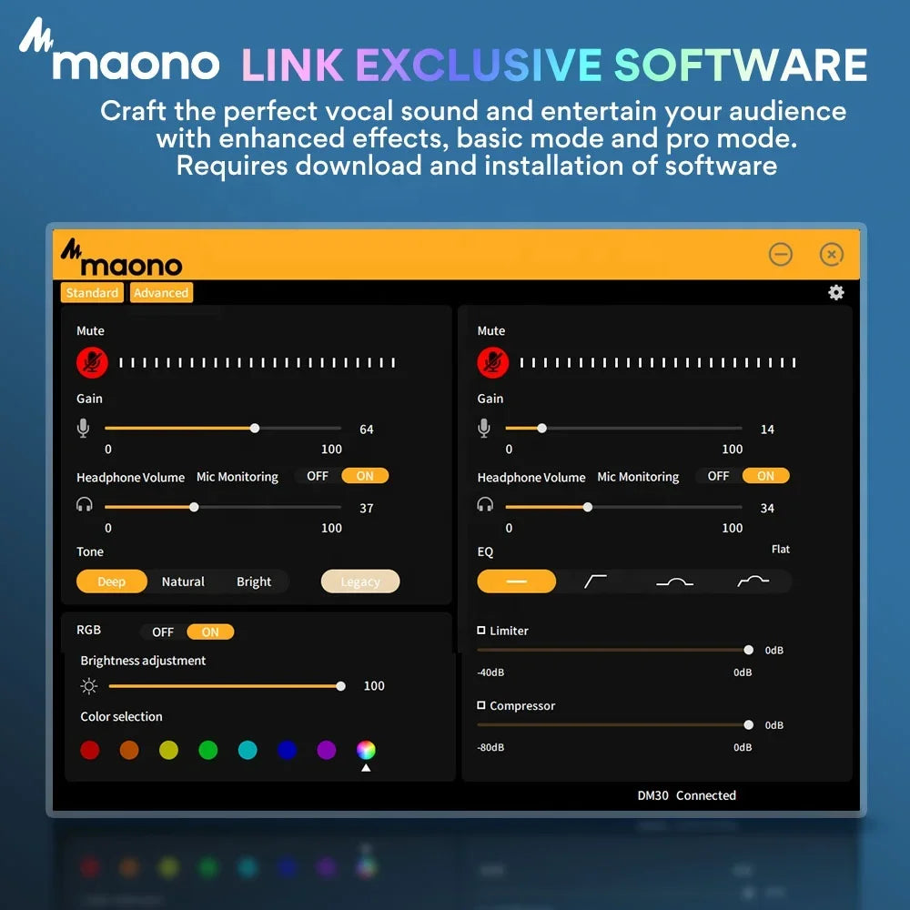 Advanced audio processing features are available through the PC/Mac Maono Link software to offer Gamers and other users more versatility. Gamers and other users would also appreciate the RGB light on the bottom of the microphone, which can be controlled by a hardware and programmed by Maono Link software.
